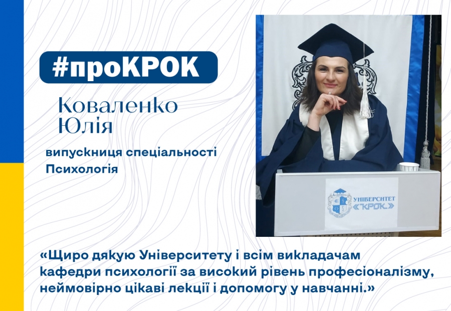 Щиро дякую Університету КРОК і всім викладачам кафедри психології за високий рівень професіоналізму, неймовірно цікаві лекції і допомогу у навчанні. За те, що вони продовжували ділитися цінними знаннями і досвідом, незважаючи на війну, настрій і втому.